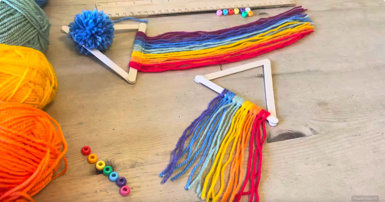 Kids are invited to stop by the library to make rainbows using different colored yarn and popsicle sticks.