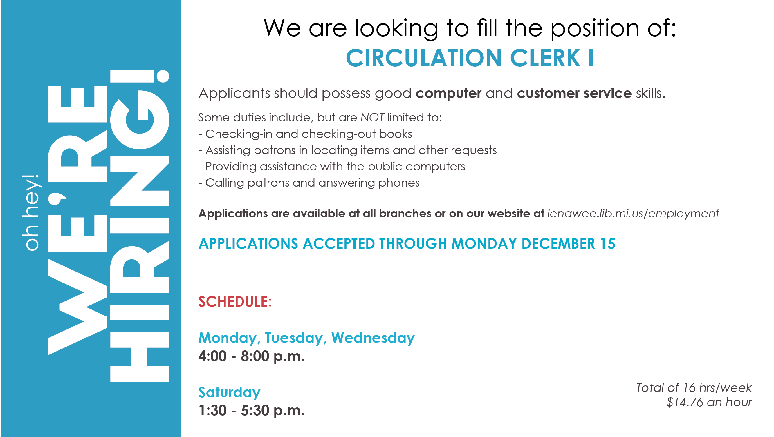 If you submitted an application for our previous clerk posting and would like to be considered for this one as well, please call us at 517-263-1011 to let us know.