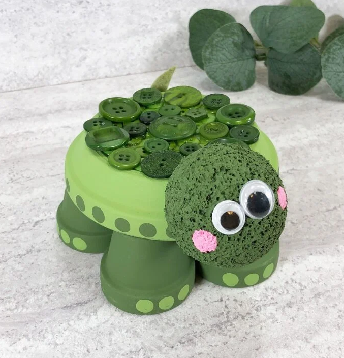 Using clay pots and other materials, craft an adorable little turtle for your garden, porch, or other sunny spot!